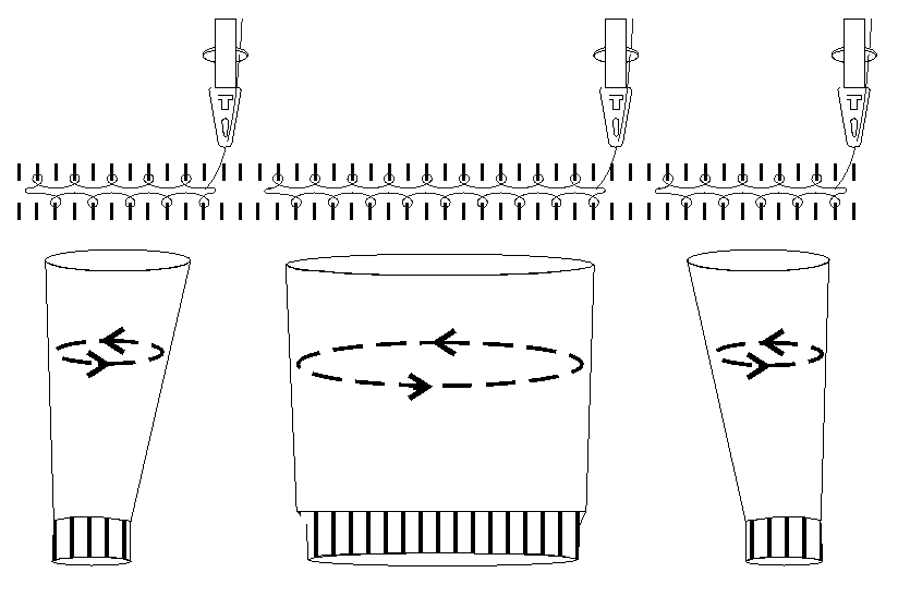 - Zu Beginn werden die Elemente Arm / Leib / Arm mit jeweils einem separaten Fadenführer nebeneinander gestrickt.