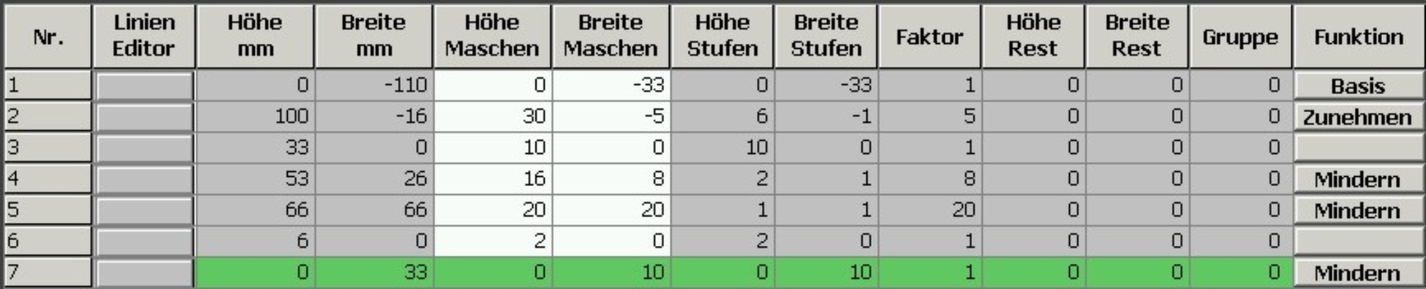 - Minderbreite: 8 Maschen (minimal 6 Maschen (halbe Breite des Ausblendmoduls))