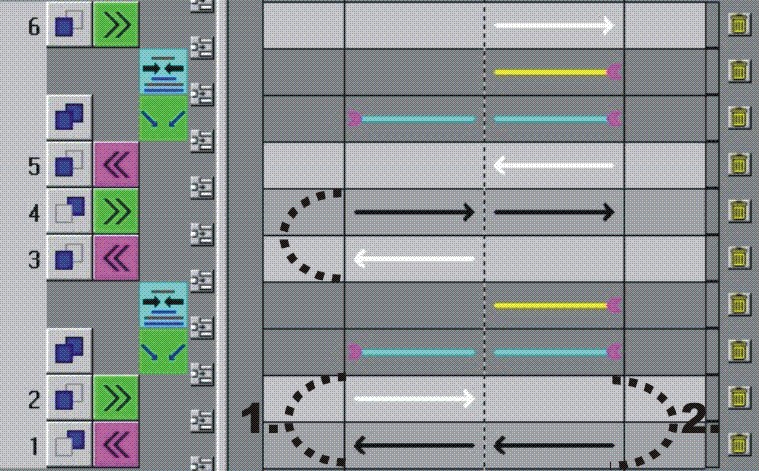 Breitenanpassung der Lagen durch Verschmälern einer Lage. Wenn die Breiten der beiden Stricklagen (L0+L1) unterschiedlich sind, wird die breitere Stricklage der schmäleren Stricklage angepasst. |