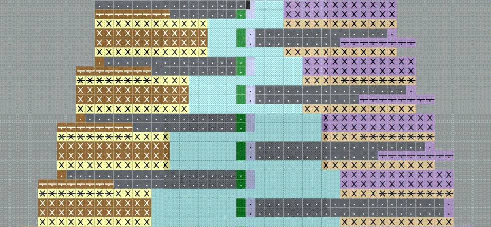 Breitenanpassung der Lagen durch Verbreitern einer Lage. Wenn die Breiten der beiden Stricklagen (L0+L1) unterschiedlich sind, wird die schmälere Stricklage der breiteren Stricklage angepasst. |