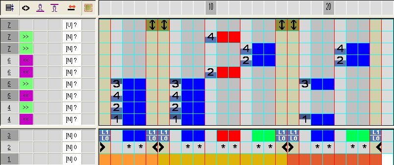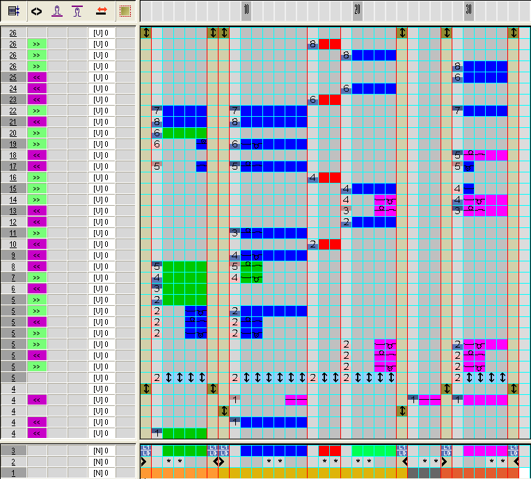 - Die entsprechenden Intarsia Musterreihen des Bereiches mit der roten Raute über die Reihenselektionsleiste selektieren.