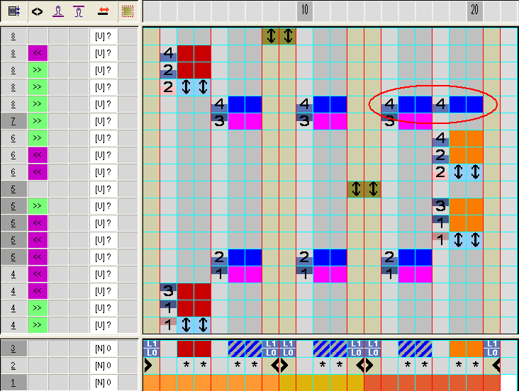 Intarsia- Bereiche innerhalb der Arm-Leib-Verbindung müssen zu einer Reihe gruppiert werden und nur die Lage hinten (L1) als Zuordnung haben.