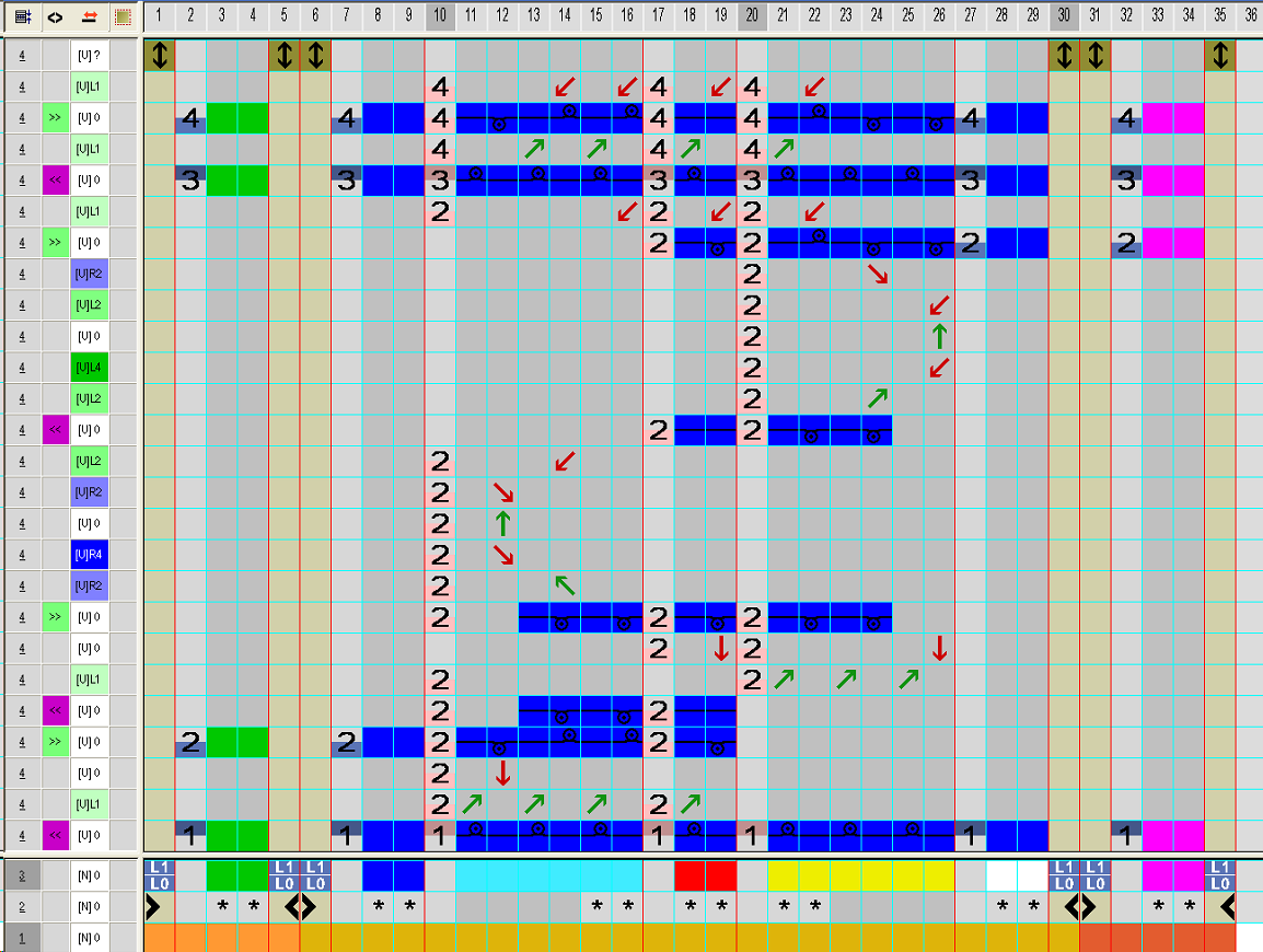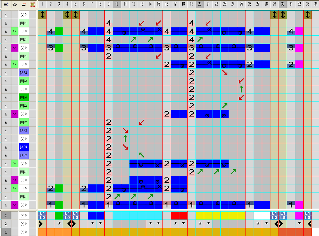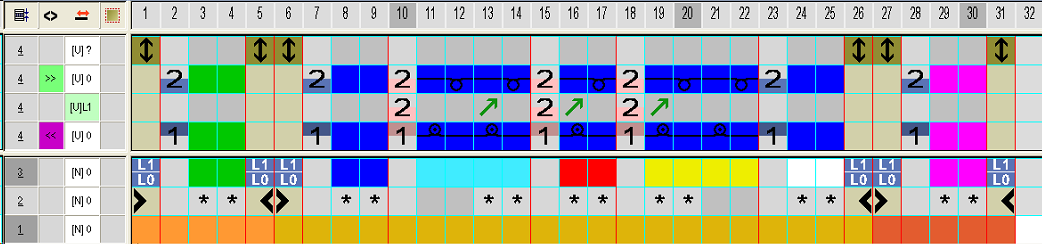 - Erste Reihe im Grundmuster (L1) und die erste Reihe der Tasche (L0) selektieren.