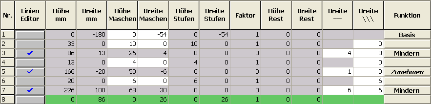 - Unter Linien links die Tabelle anlegen und die Werte für das Vorderteil / Rückenteil eingeben.