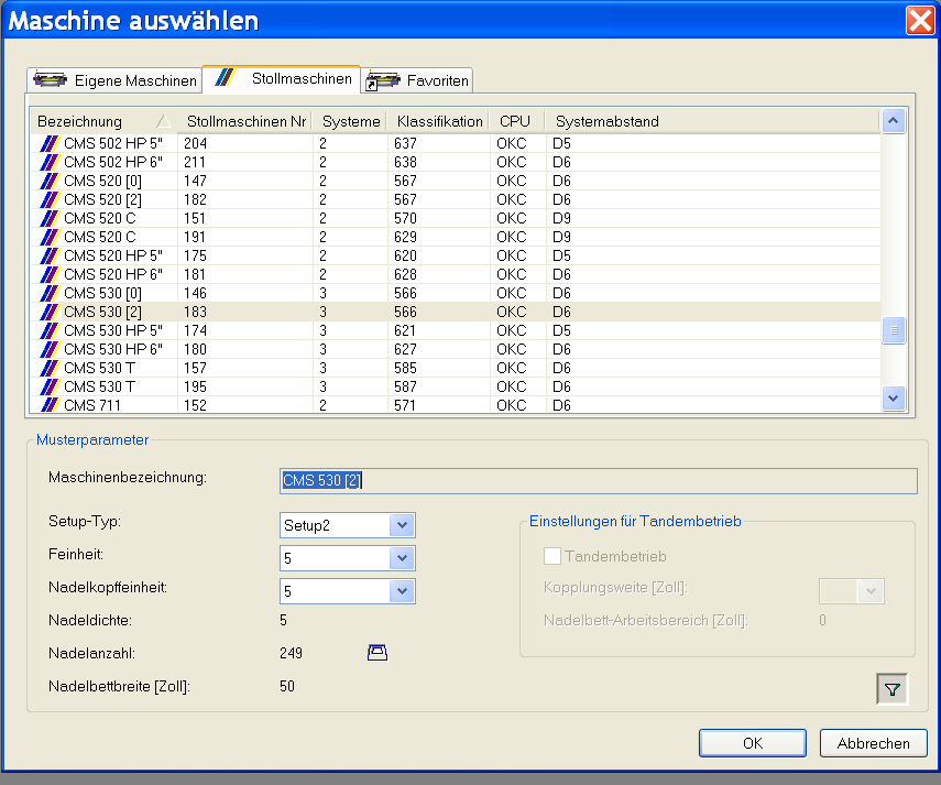 - Bei Auswahl des Maschinentyps Tandem unter die gewünschten Vorgaben angeben.