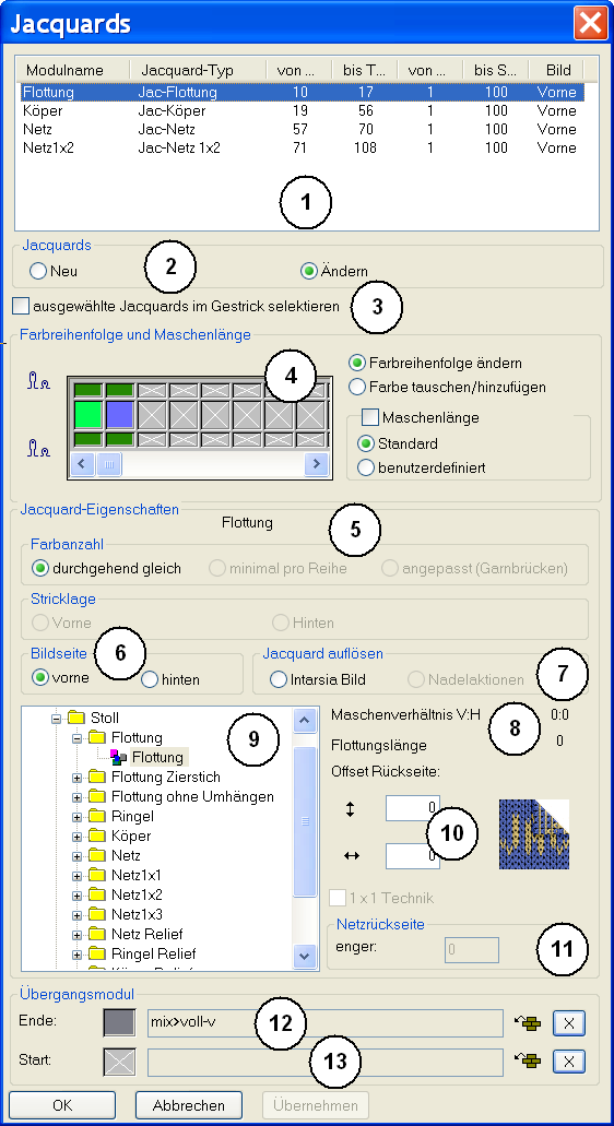 Bei ausgewähltem Jacquard-Modul kann mit Hilfe der Taste ? der Module Support geöffnet werden.