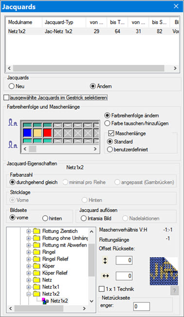 | Ab Anzahl der Netzmaschen | Anzahl der Netzmaschen auf der Jacquard-Rückseite festlegen, ab welcher das ausgewählte Modul eingetragen werden soll.