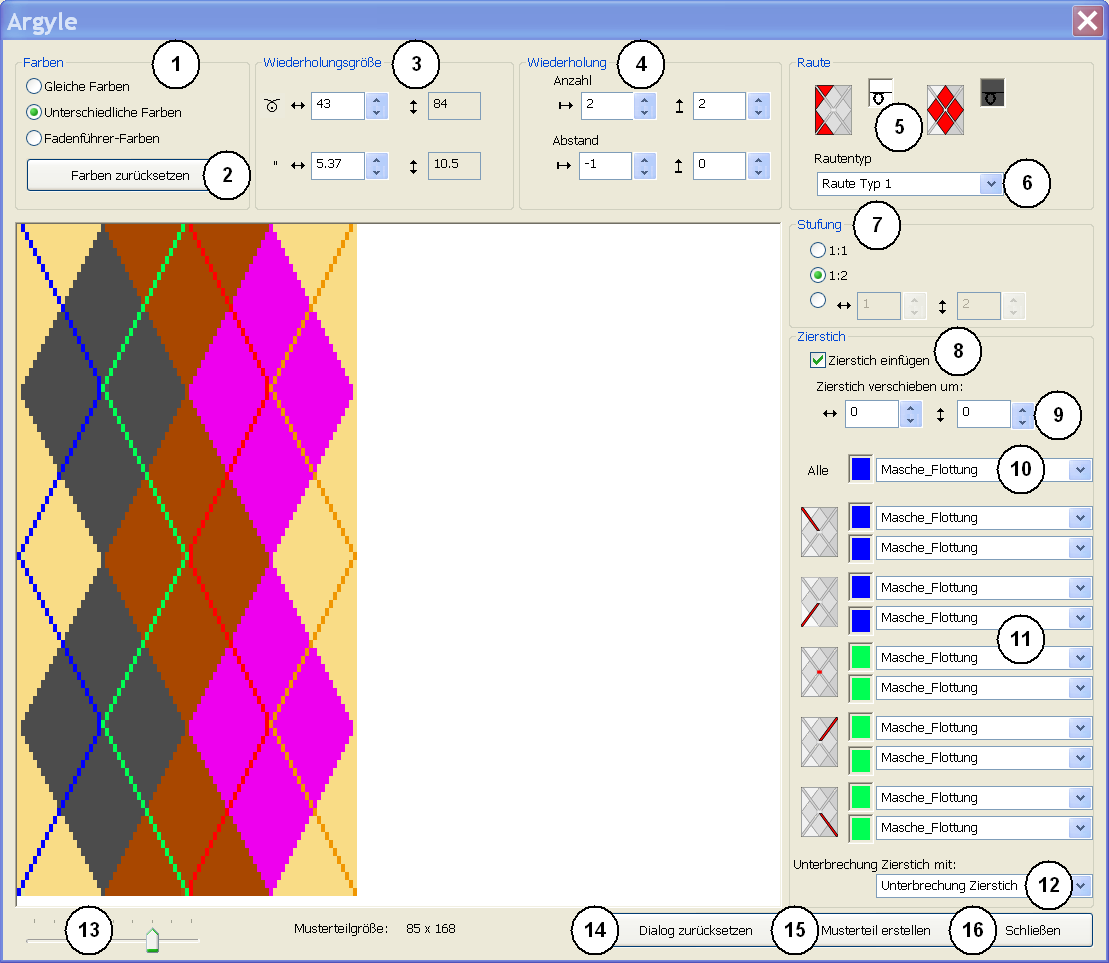 | Rauten und Umgebung mit unterschiedlichen Farben aus der Garnfarben-Palette anzeigen |