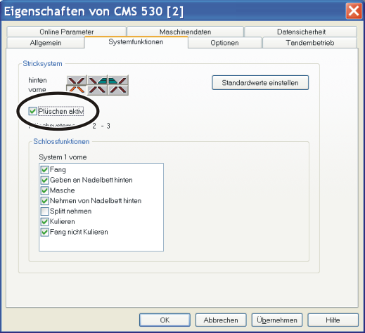 - Eine Meldung erscheint, ob die Schlossfunktionen für das Plüschstricken angepasst werden sollen. Dies mit Ok bestätigen.