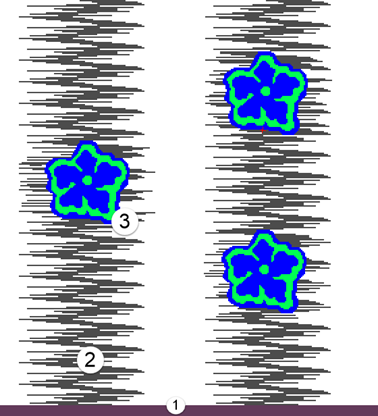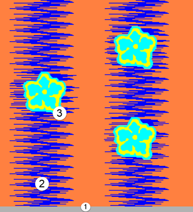 Beim sogenannten Stoll-ikat plating ® benötigt man für jeden Farbwechsel in einem System zwei Plattierfarben (= eine Plattierfarbenkombination) pro Musterreihe.