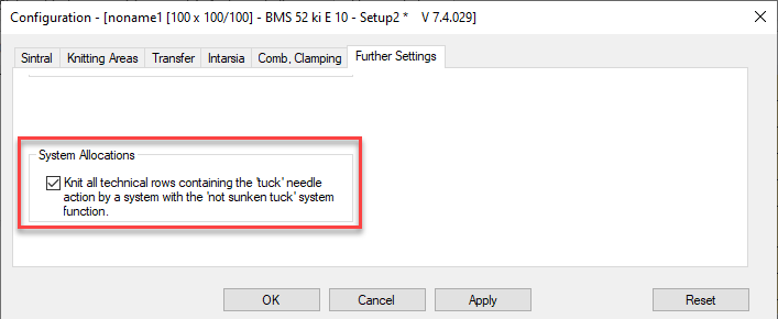- In Configuration / Further Settings, you can enable the 'Knit all technical rows containing the needle action by a system with the system function' option.