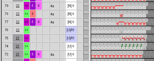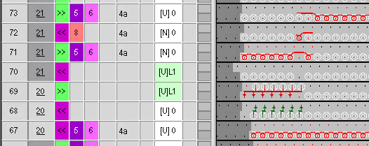Same knitting direction is present twice. - The arrows >>-<< and <<->> of the module name show the direction from which the yarn carrier for the closing stitch is knitting.