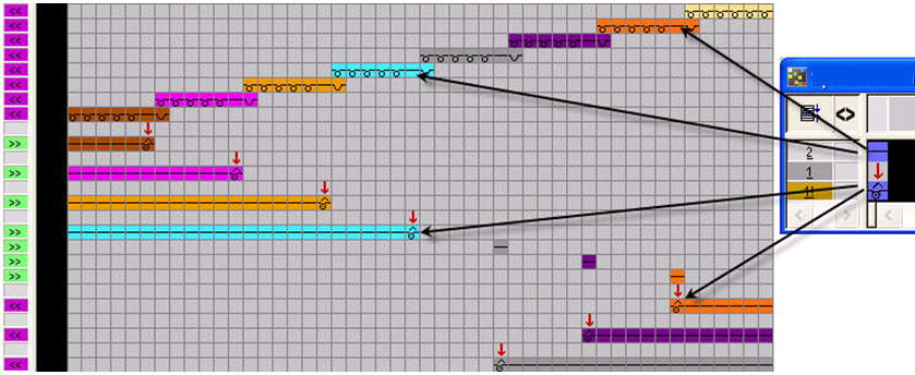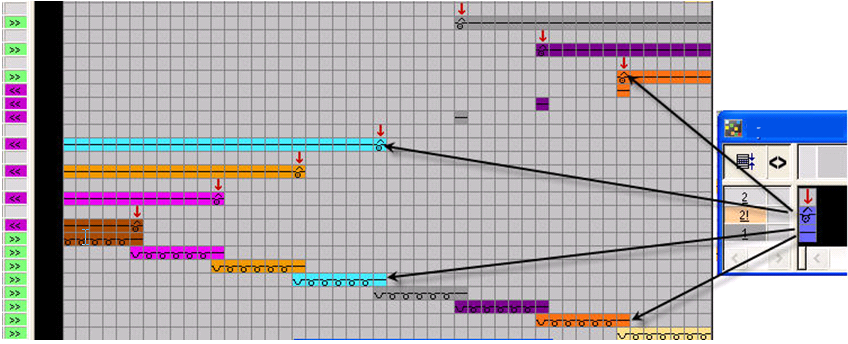 - Swiveling of the yarn carrier is switched off in the splitting row to prevent binding the thread with transferring.