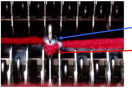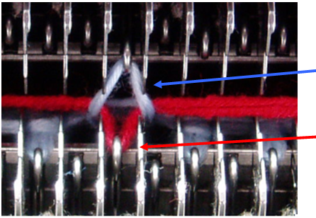 The red yarn (contrast color) is knitted-in and splitted with floating.