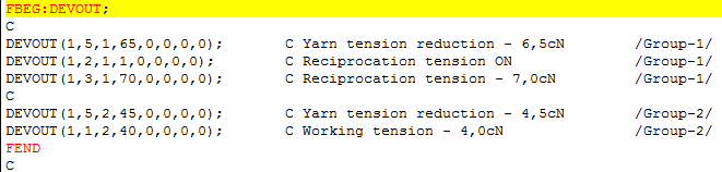 - Activate the reduced yarn tension for the used groups and define the yarn tension for the reduced yarn tension.