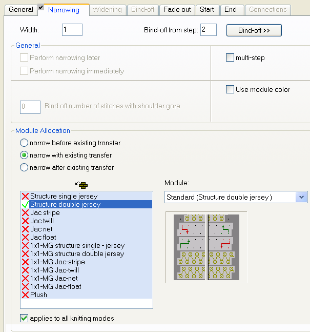 - Allocate the generated fade-out module Tubular Edge_V-left to the knitting mode of the basic pattern (single jersey structure) by drag & drop.