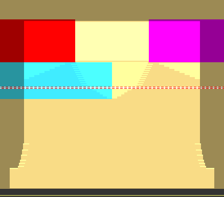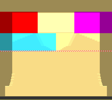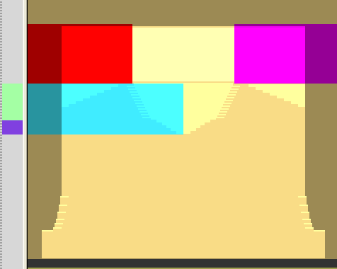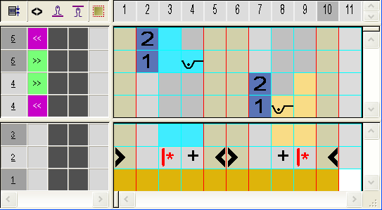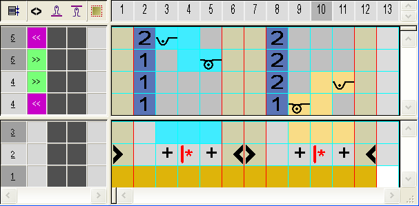 Due to the reference row numbers entered in rows without knitting specifications, the shape edges will be inserted in those rows with their corresponding shape data (= edge color).