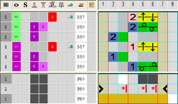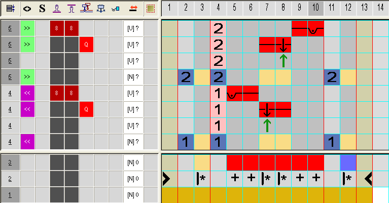 - Zusätzlich zur Garn-/ Fadenführerfarbe entsprechend der Struktur ‚Reiskorn’ die Nadelaktion Schussfaden/ Umhängen nach vorne mit Flottung oder Schussfaden/ Umhängen nach hinten mit Flottung einzeichnen.
