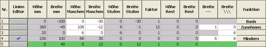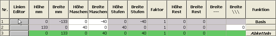 - Unter Linien links die Tabelle anlegen und die Werte für das Vorderteil / Rückenteil eingeben.