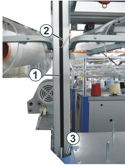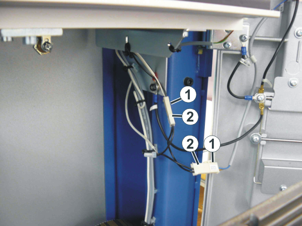 - Unplug the plug connection (1) of the lateral yarn tensioners.
