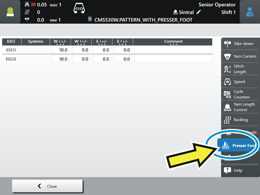 Specify the indices (ESCI1, ESCI2…) for the corrections of the presser feet on the M1plus (Presser Foot control column ). - On the knitting machine