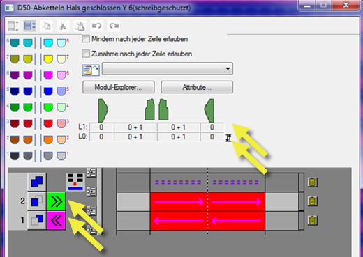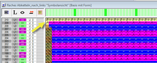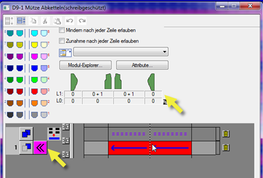 - The necessary knitting sequence for the knitting additional row L1 and the additional row L0 is taken automatically from the k&w Arrangements / Stoll / 1 area / bind-off collar / without opening module group.