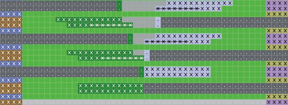 En algunos k&w Arrangements el número de pasadas tejidas hasta el menguado en las dos capas de tisaje es distinto.