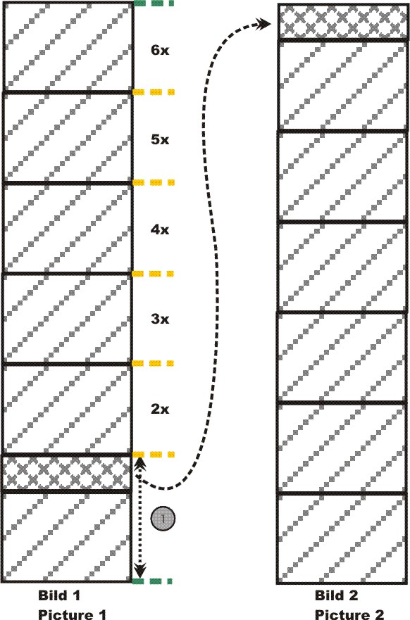 Las pasadas de forma de la manga derecha (1) no procesadas en el ciclo 1 se desplazan hacia arriba y se procesan en el siguiente ciclo 2. | |||