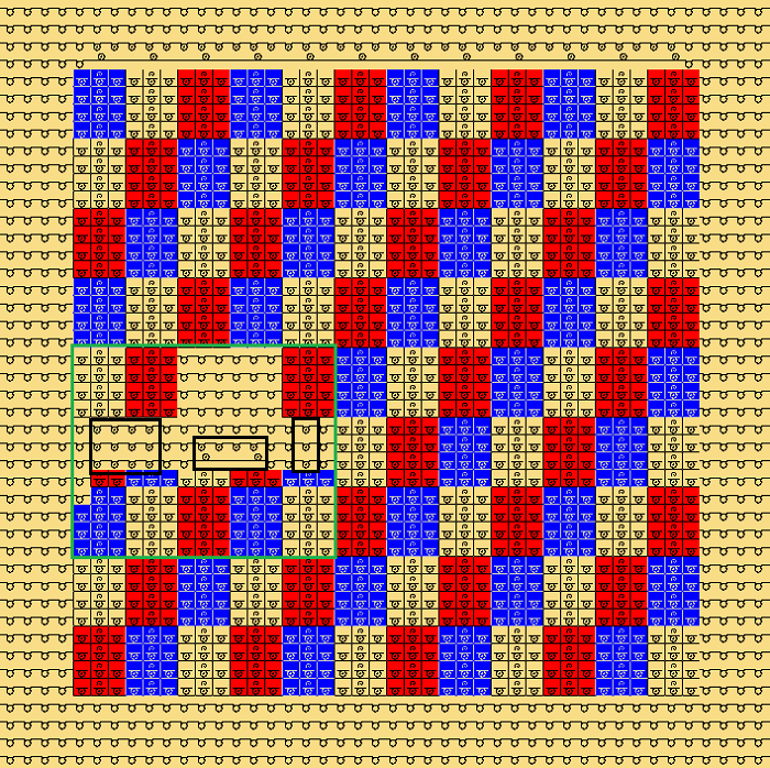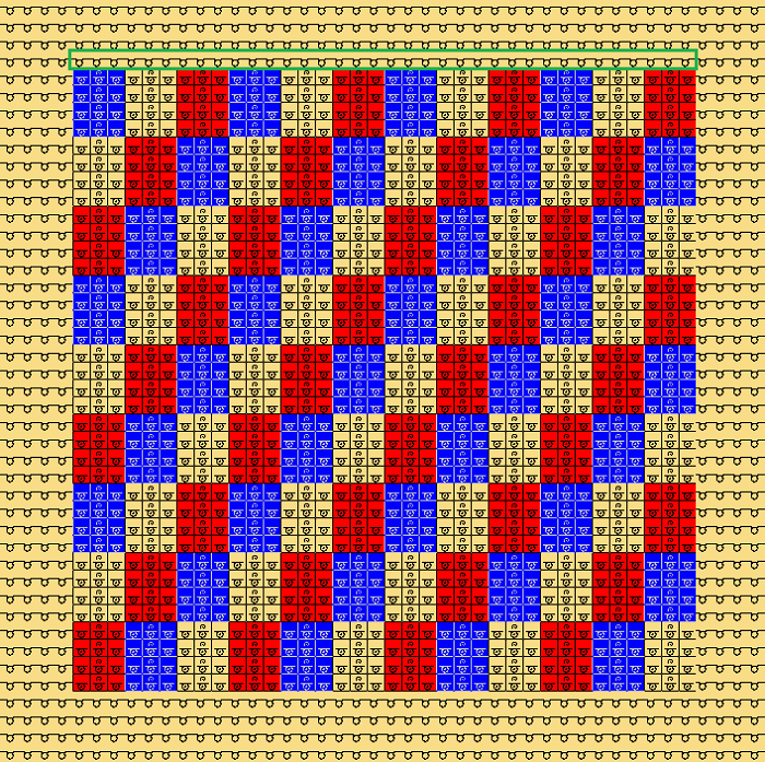 Dans l'espace libre Maille avec report est automatiquement remplacé par Maille sans report afin que les mailles de réseau ne soient pas emmenées vers l'avant avec le report automatique. Ce n'est que dans la zone jacquard suivante que l'envers du réseau continue à être tricoté. - Recommandation : N'empêcher la fin de réseau que pour quelques rangées intermédiaires.