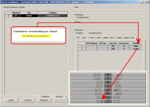The default Sintral function is automatically used for the CMS530HP_B: combthread_B.sin. With this Sintral function, the yarn carrier home position for the draw thread is on the left on track 1 and for picking-up after pressing-off on the right on track 8