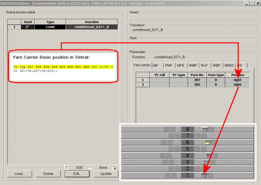 Restriction: In the yarn field it is not possible to move the comb thread and the draw thread to another side. The sides of the yarn carrier are firmly specified by the Sintral and cannot be changed in the yarn field.