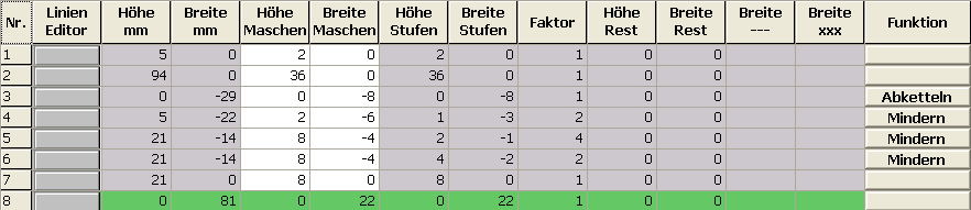 À la ligne de lisière n°5, le côté droit de l'élément de base est élargi de 8 aiguilles (largeur de la bordure) parce que la bande tubulaire est reportée (report latéral) une rangée avant.
