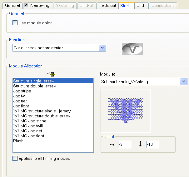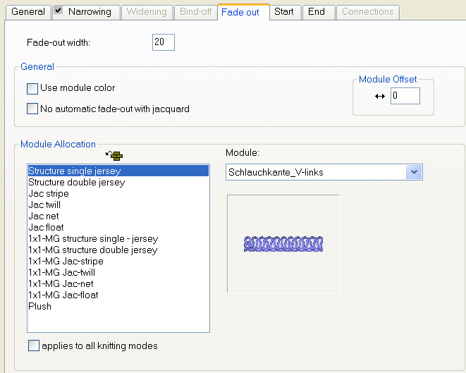 - Avec Glisser-Coller attribuer le module de départ créé Bande tubulaire_V-gauche au mode de tricotage du motif de base (structure à une fonture).