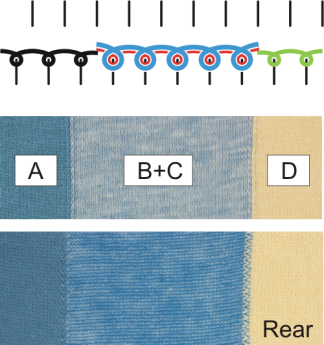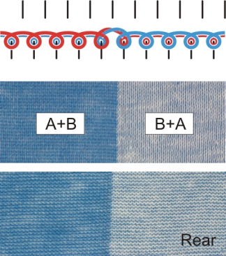 Stoll-ikat plating ® | Deux fils travaillent ensemble dans une zone et changent de position (position de base, position de vanisage) sans changement de chute Résultat: | |