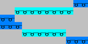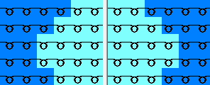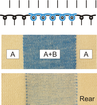 Vanisage sélectif | Deux fils (ou plus) travaillent ensemble seulement dans une zone sélectionnée. Dans la même rangée de tricotage au moins un fil est aussi utilisé à l'extérieur de la zone sélectionnée. |