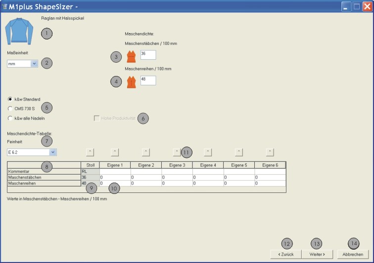 1. The measure unit (2) and the stitch density (3) + (4) will be used for further processing.