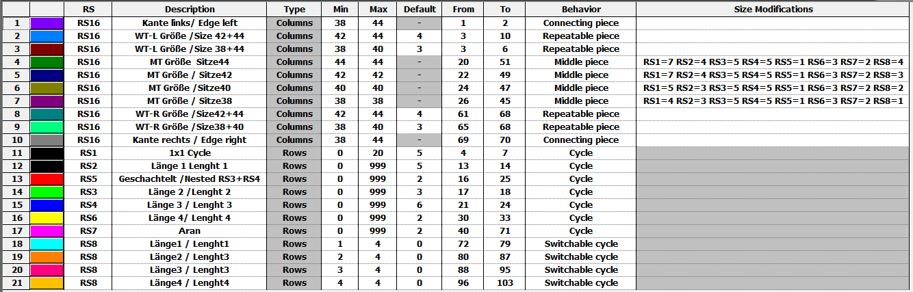 Dans la boîte de dialogue Rapports, vous pouvez, sous Modifications de la taille et lors de la création des rapports de largeur indiquer directement les rapports de longueur pour la taille correspondante avec le nombre de répétitions désiré.
