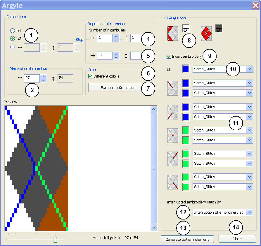 Résultat : Chaque losange est tricoté en entier sur la largeur. | |||||||||||