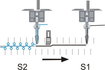 L'introduzione del filo di trama e la lavorazione hanno luogo nello stesso sistema (S2). Il sistema S1 può essere impiegato per un'altra azione.