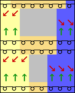 Per una diminuzione con scalatura di valore superiore a 1 vengono inseriti automaticamente fili flottanti, al fine di evitare maglie doppie.