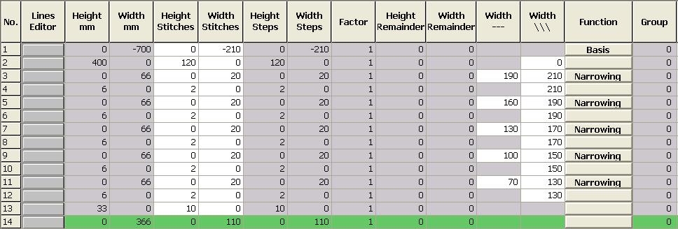 - Definire gli stessi attributi per le altre cimose della forma no. 7, 9 e 11 e completare la tabella della forma.