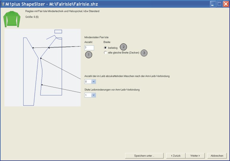 - Formvorgaben und unter Minderstufen Fair Isle gewünschte Vorgaben eingeben:
