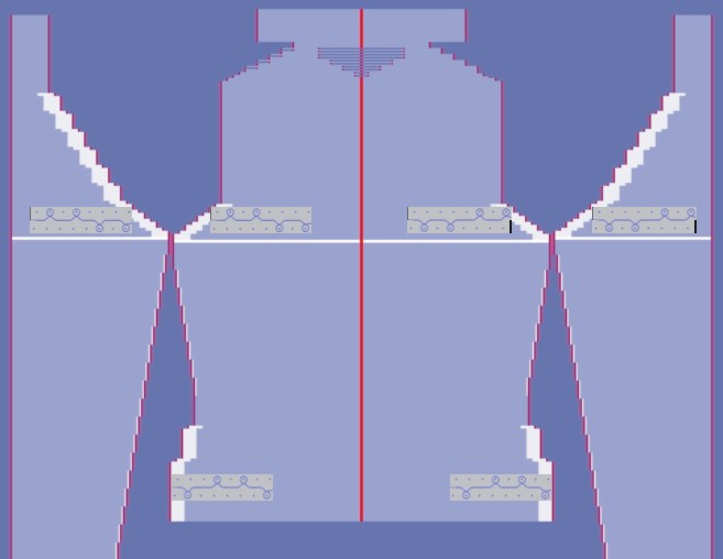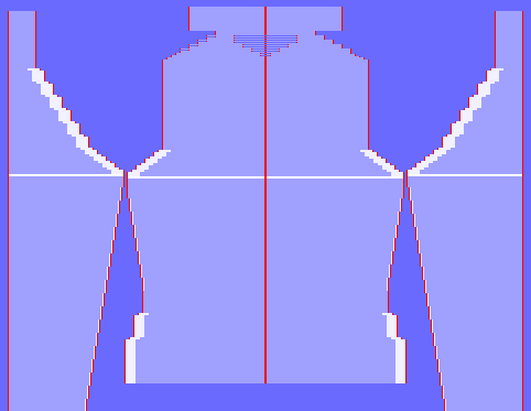 - Die Elemente Leib und Ärmel horizontal so positionieren, dass die 2x2-RL Rippe vom Leib in die Ärmel durchgehend sind.