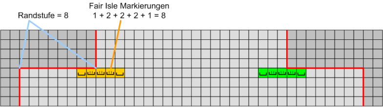 Por cada prega deve ser desenhada um bloco de marcações de minguado Fair Isle o qual mostra uma largura de superposição de 1 nas posições exteriores e uma largura de superposição de 2 no centro.
