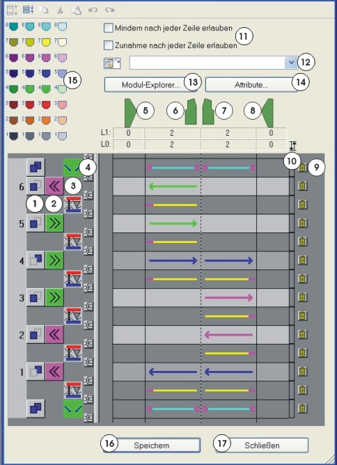 The k&w Arrangements control the knitting sequence of the yarn carriers and the shape modifications in the shape parts.