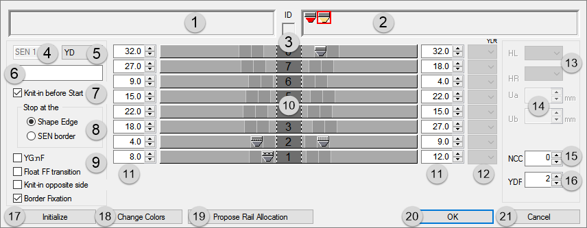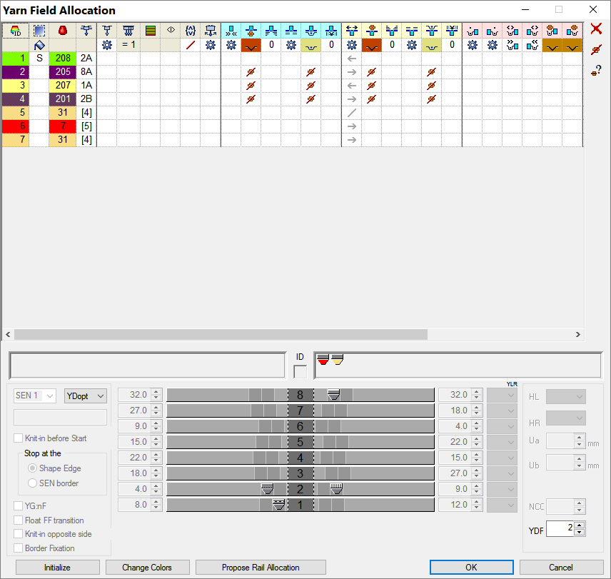 VI. The yarn carrier allocation in the Yarn Field Allocation dialog box: