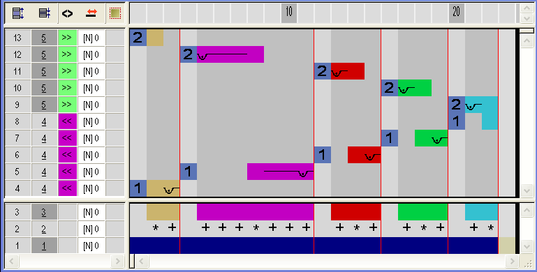 通过带有+符号标记列数的颜色区域中的放针 +符号撤销激活设定中的设置或纱线区域分配对话框. |
