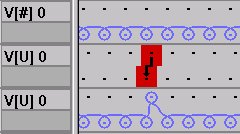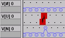| 头两行被合并形成一个动程。 | 不进行行合并形成一个动程。由于导纱器位于另一侧,翻针行之后需要一个空行。 |