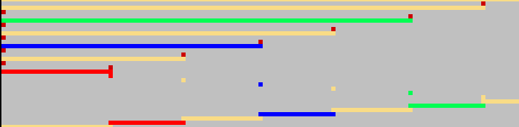 浮线和分针方式编织带出导纱器 用浮线方式将导纱器带到并停在织物边缘,可同时处理多个导纱器: 工艺 嵌花编织带入 喂入 << 左侧浮线分针编织带出 >> 右侧浮线分针编织带出 示例:一个花型行中多个导纱器时<< 左侧浮线分针编织带出请参阅...打结分针