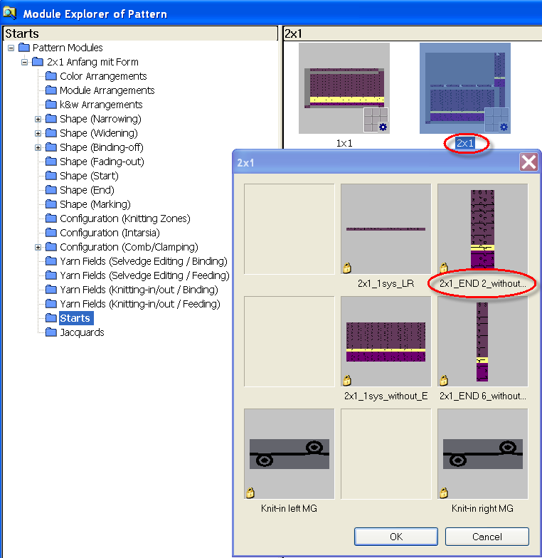 在编织从右向左空转行时,最后一个新勾起的网眼线圈 (2) 可能会从上升的织针处掉套。对于这种情况,可以使用起头工艺包模块中的编号为2的模块END 。